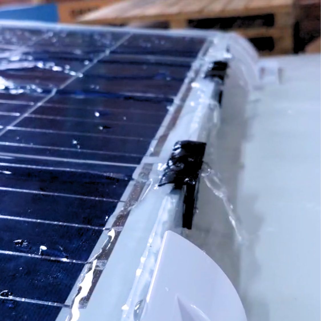 Projetada para canalizar a água da chuva de forma inteligente, ela facilita a limpeza da poeira e sujeira acumuladas sob seus painéis solares — aumentando a eficiência e reduzindo a necessidade de limpezas frequentes.